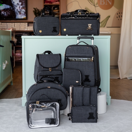 Mala de Rodinhas de Bordo, Bolsa Golden, Mochila Malu dois em um, Trio de Saquinhos Organizadores, Pasta Troca, Necessaire Media.