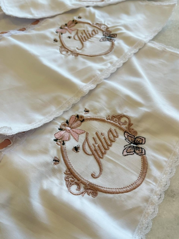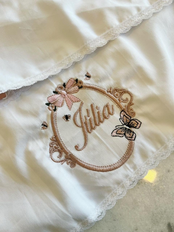 A área do bordado personalizado é aplicada em algodão egípcio 400 fios, um tecido nobre, reconhecido mundialmente pelo seu toque acetinado, resistência e acabamento sofisticado. Esse detalhe transforma um item essencial do dia a dia em uma peça elegante, afetiva e exclusiva.